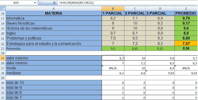 En esta práctica que realizamos en Excel, agrupamos nuestras calificaciones de todo el semestre agrupándolas por semestre y promediando cada uno de ellos así como también sacamos el valor máximo, el valor mínimo, la moda, la mediana y el total de dieces, nueves, ochos y sietes en todo el semestre.